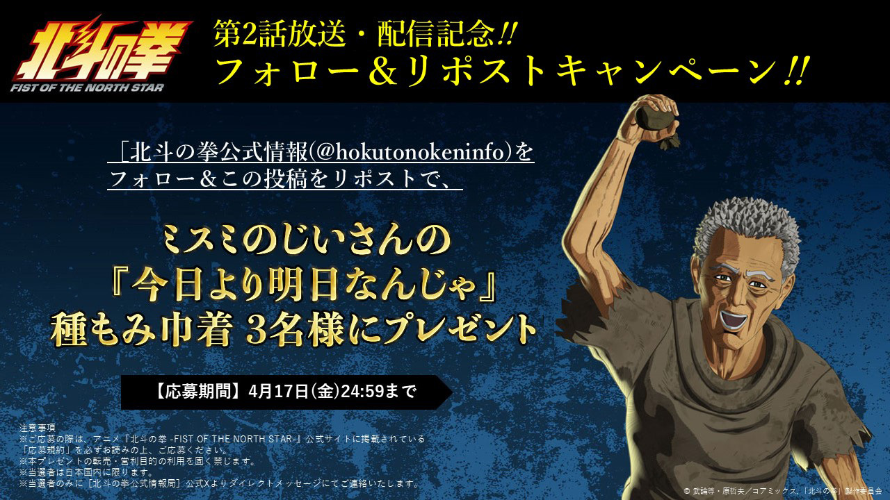 - アニメ『北斗の拳 -FIST OF THE NORTH STAR-』(以下「本作品」といいます)の公式Xアカウント(@hokutonokeninfo)をフォローしてください。